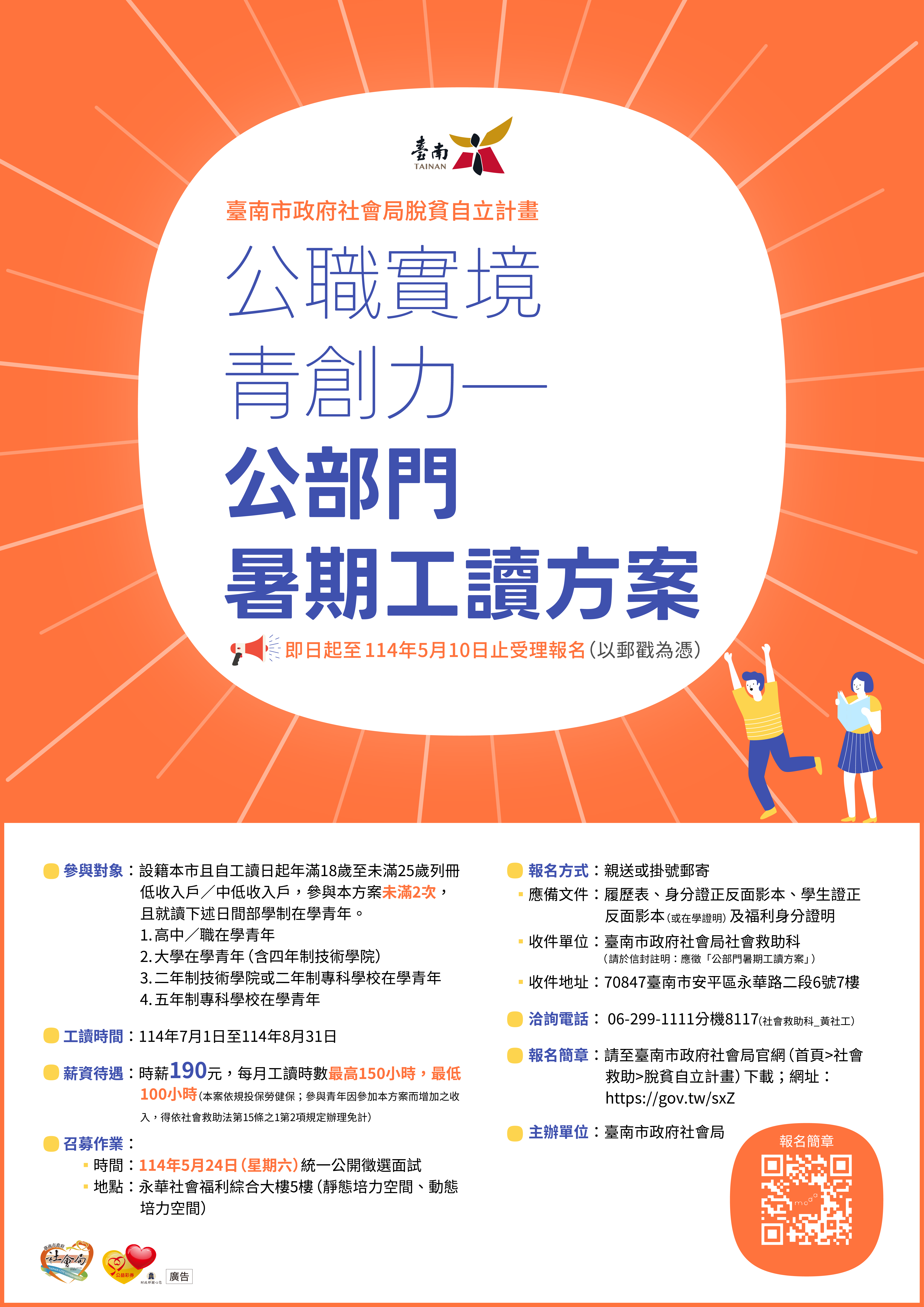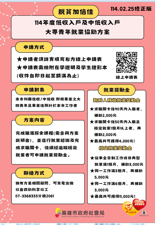 - 「脫貧加倍佳─114年度低收入戶及中低收入戶大專青年就業協助方案」