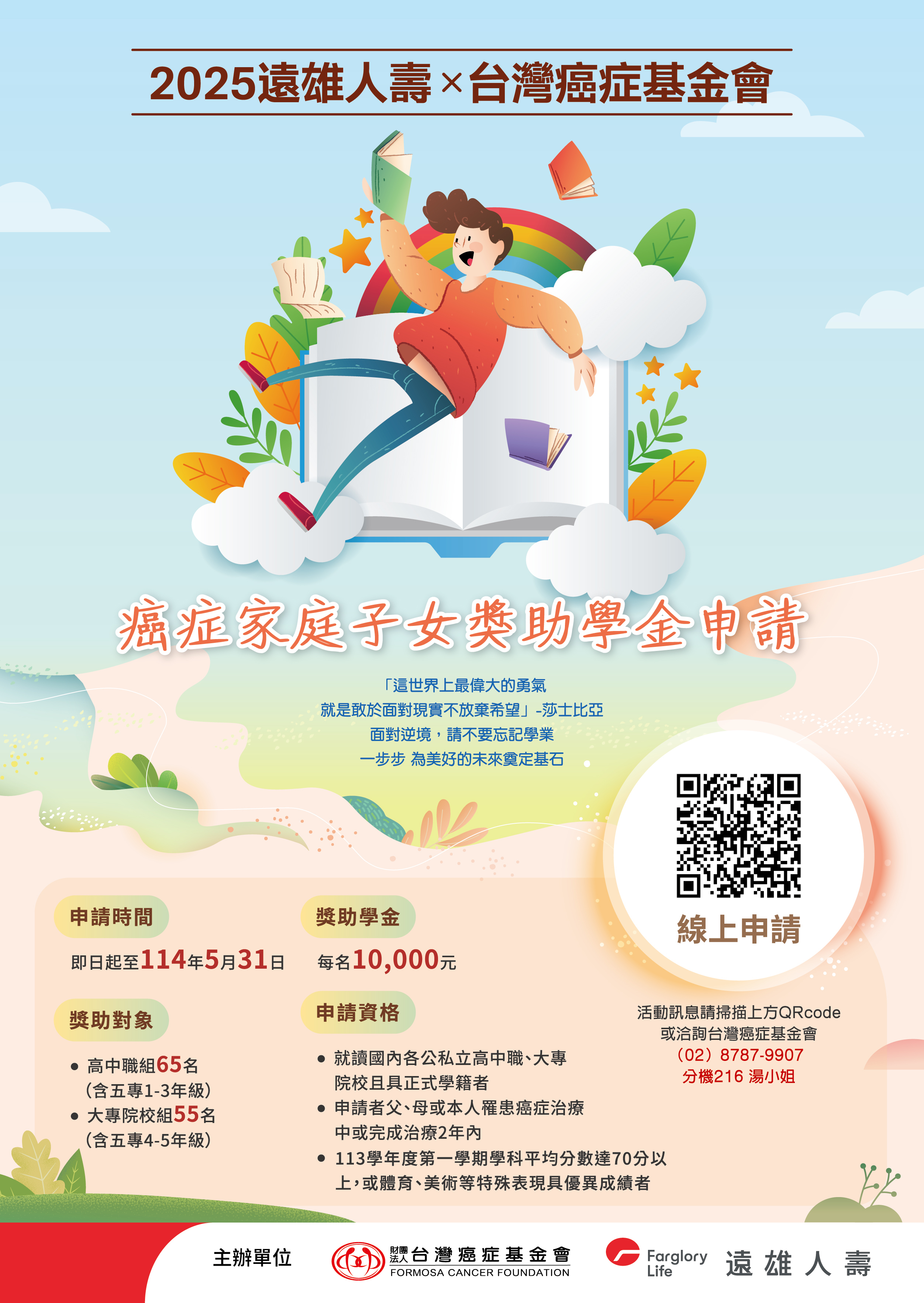 - 2025台灣癌症基金會x遠雄人壽-癌症家庭子女獎助學金(5月31日止)