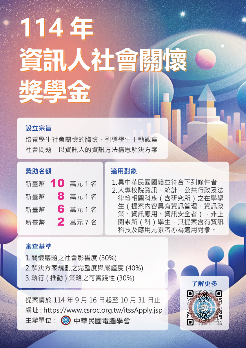- 中華民國電腦學會「114年度資訊人社會關懷獎學金」(10月31日止)