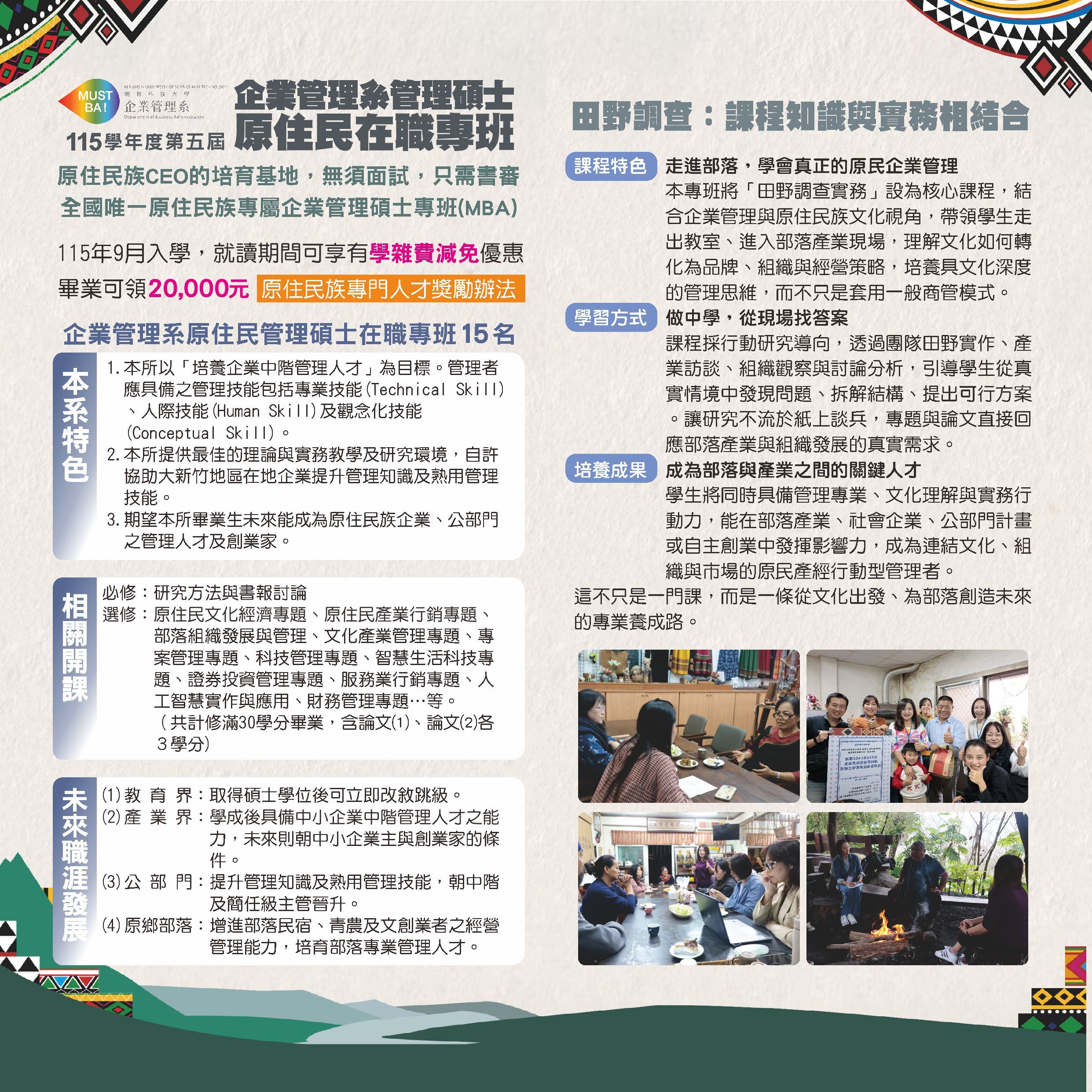 明新學校財團法人明新科技大學 115學年度第五屆企業管理系管理碩士原住民在職專班招生相關訊息